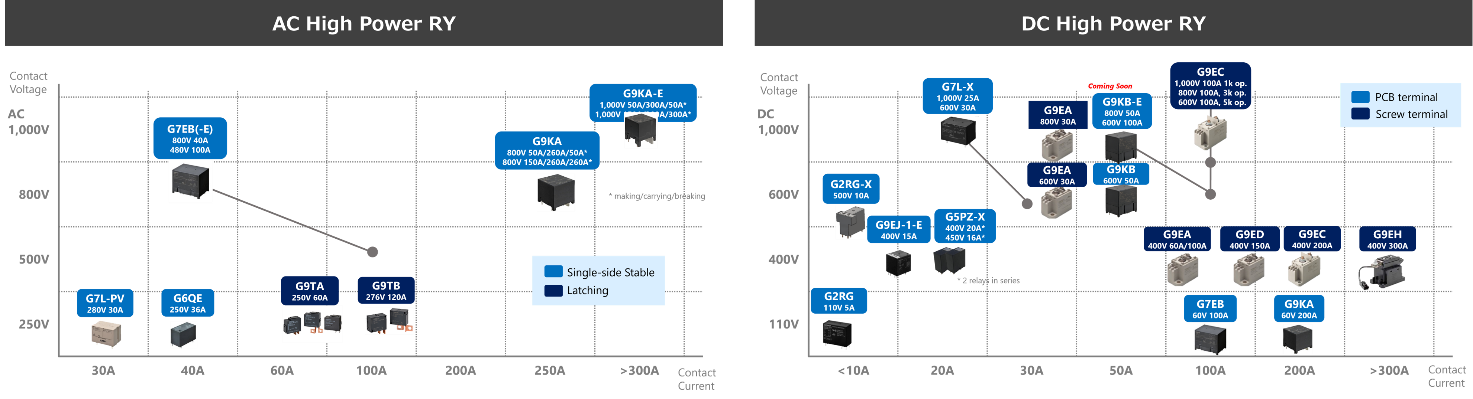 G9KB-E是G9KB系列的高容量型號,雖然其尺寸和重量與G9KB標準型相同,但將最大開關電壓擴展到800V DC,最大載流電流擴展到100A。DC800V 50A和DC600V 100A的額定值特別適合儲能系統(tǒng)和EV充電器/V2X等15-40kW級蓄電池相關應用。